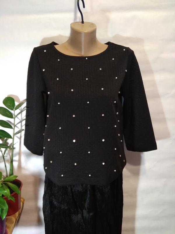 Нарядная,оригинальная кофта декорирована стразами и бусинками. Ткань плотная . Длинна 54см, плечо 7см, рукав 43см, пог 46см, пот 47см, низ 48см.