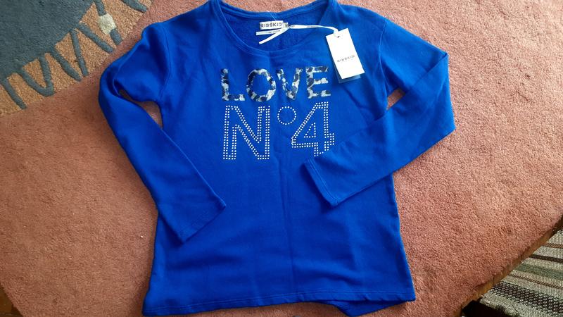 Красивый свитшот синего цвета с надписью (накатка и камушки) на груди прекрасного качества итальянского бренда Risskio Произведено в Турции, Спинка длиннее, перед короче с длинным рукавом.