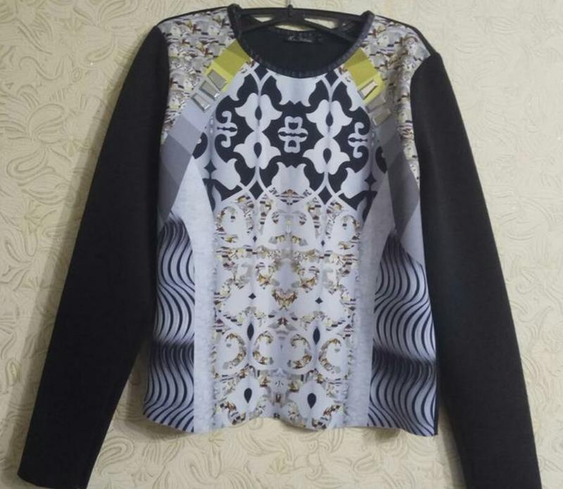 Світшот,лонгслив 46-48 р-ра.,в актуальний принт розшитий зверху камінням(фото 2),окантовка горла pu - шкіри,края виробу не оброблені.Виглядає дуже красиво. Склад: поліестер. Заміри: плечі 39 див.; рукав 62 див.; про.грудей 50 див.; довж.вироби 58 см. Відішлю після 100% оплати на картку. Відправлю Новою або Укр.поштою. За додатковою інформацією звертайтеся.
