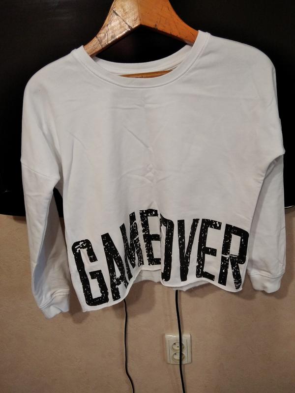 укороченный свитшот на баечке надпись не краска свободного кроя низ не обработан