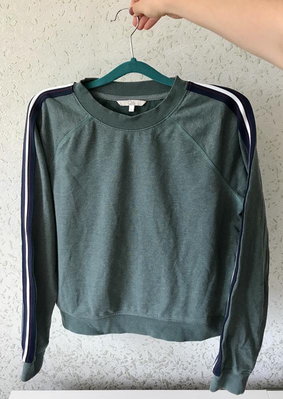 Женский свитшот Clockhouse приглушенного цвета морской волны с лампасами на рукаве. Указан размер L, но по факту это S-M{!}, прошу обратить на это внимание. Состав 65% коттон, 35% полиэстер. Состояние хорошее.