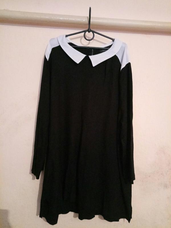 тонкий вязаный свитерок черного цвета с белыми вставками на плечах, круглый вырез горловины с отложным белым воротничком, рукава 1/2, по бокам разрезики, застегивается сзади на металлическую молнию. ПОГ 58см, ПОТ 57см, ПОБ 59см, плечо 12см, рукав 47см, длина 67см. Отправка Укрпочтой или Новой почтой.