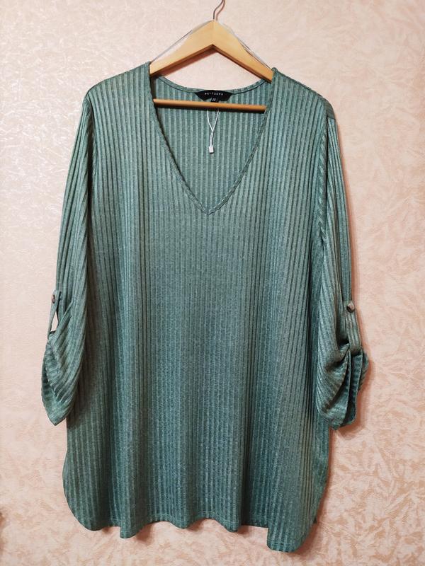 Тонке в'язане полотно в рубчик. По боках заокругленые розрізи. Рукав коротшає і фіксується хлястиком. Універсальна модель. Розмір вказано-UK-22. Всі виміри в спокійному стані. ПОгруди-66см, ПОниза-67см, Довжина рукава від горловини-68см, Довжина переду-78,5 см, Довжина спинки-81см.