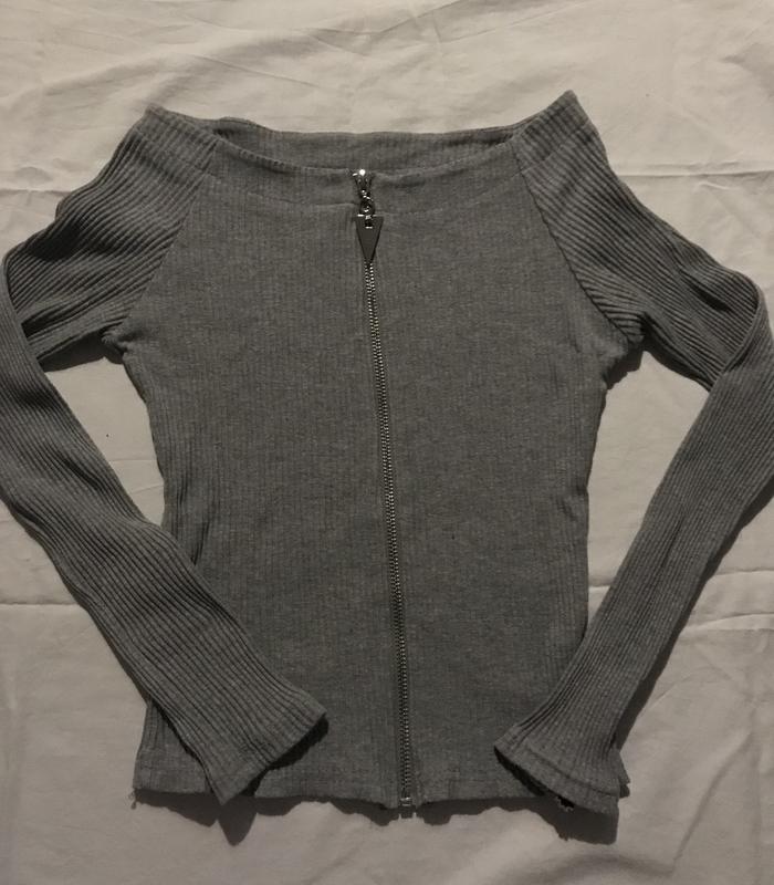Продам укорочённую кофту в рубчик, с оригинальным замком, в идеальном состоянии. Плечики немного приспущены, рукав регланом. Коттон. Размер XS-S.