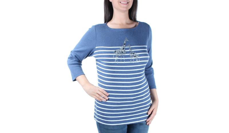 Новий, з бірками, светрик, лонгслив, світшот з котону найвищої якості бренду KAREN SCOTT (США), прямого силуету, з рукавами довжиною 7/8 , блакитного джинсового кольору в білу смужку з декором "жирафи з прозорих камінчиків. В наявності 2 розміри : L 48-50 рр, XL. 50-52 рр. Розміри повномірні. Заміри по виробу в 2-х розмірах. Длина = 64-65 см L и 65-67 см XL ПОГ = 52-58 см L и 56-61 см XL ПОТ = 47-52 см L и 50-56 см XL ПОБ = 52-55 см L и 55-60 см XL Плечи = 40 см L и 41 см XL Длина рукава = 47 см L и XL 1/2 обхвата рукава в области бицепса = 19-22 см L и 21-24 см XL Состав: 100% cotton Доставку оплачивает покупатель. Отгрузка после частичной или полной предоплаты. Возврата и обмена нет.