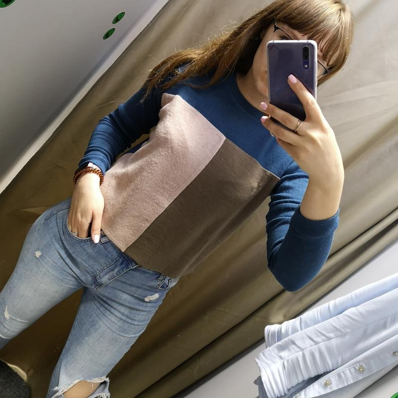 Модный свитшот украинской ТМ Carica Размер S. Свитшот немного укороченный. Замеры: Ширина: 49 см Длина: 47 см Красивое сочетание цветов. Спереди такой как на фото, сзади однотонный синий. Состояние вещи: Новое (но была срезана этикетка) Состав ткани: 50 % шерсть, 30 % вискоза, 20 % полиэстер