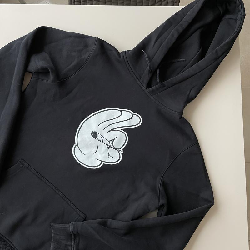 Чёрный свитшот ,размера хс,на хс сидит свободно и длинный достаточно ,плотная ткань и утеплённый внутри
