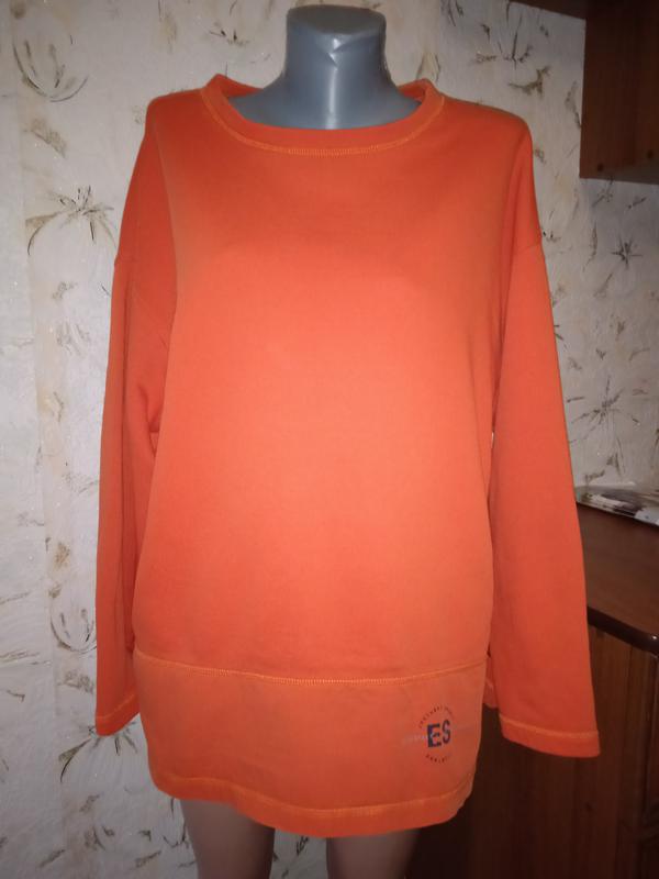 Размер на фото 2, смотрите замеры. Цвет мандарина. Ткань двухнитка, средней плотности, немного тянется. Внизу вставка - ткань не тянется. Этикетки с составом ткани нет, на ощупь как хлопок. Состояние очень хорошее, без дефектов, цвет не утерян. Длина от верхней точки плеча к низу 72. Длина рукава от горловины 73. П/о бицепса 23 тянется до 26. П/о груди 66. П/о талии 63. П/о внизу 59. 53.