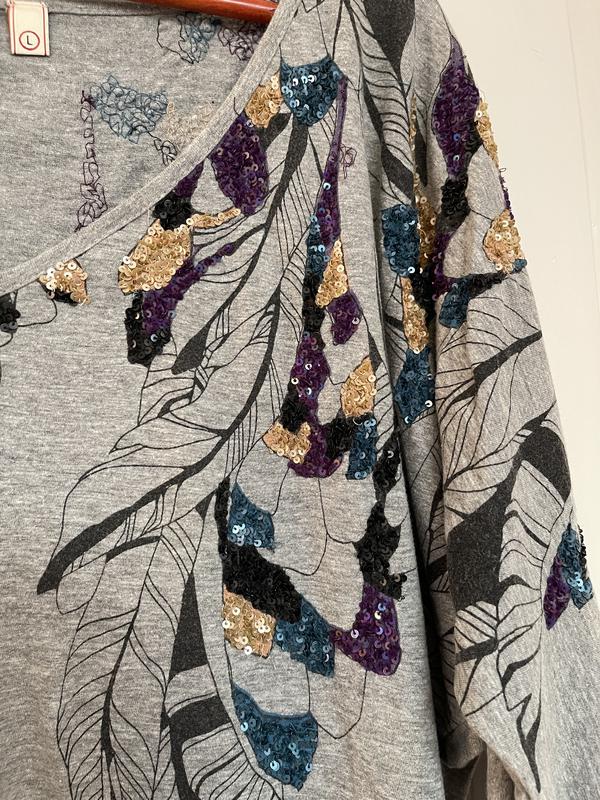 Летуча миша. Длина по спинке от плечевого шва вниз 74-75 см. По составу это тоненький шлифованный французский коттон. Точнее - 85% коттона + 15% вискозы. Красиво тянется. Приятная к телу. По низу ПОБ 56+. в спокої. Тянется до 66+. ПОГ там летуча миш 70-75. Рукав зауженный. Выглядит очень красиво.