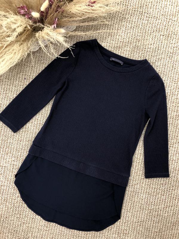 Оригинальная кофта-блузка в классическом стиле, рукав 3/4, цвет темно синий, красивая приятная ткань. Крутая модель. Длина кофта 51 см, длина вместе с шифоновым низом 76 см, сзади немного длинее. Рукав 49 см ОГ 86 см Трикотаж тянется