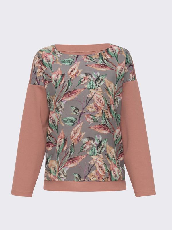 Перед принтованный (двухслойный = основной материал - джерси + цветной шифон) - выглядит даже нарядно Спинка и рукава однотонные Цвет как на фото - на этикетке - пудра р. 50 ЗАМЕРЫ: ширина 56 (подмышками) 52 (низ) длина 62 (замер от плечевого шва) плечо 21 рукав 45 плечо приспущено (плечо + рукав = 66см) в целом рукав НЕ короткий