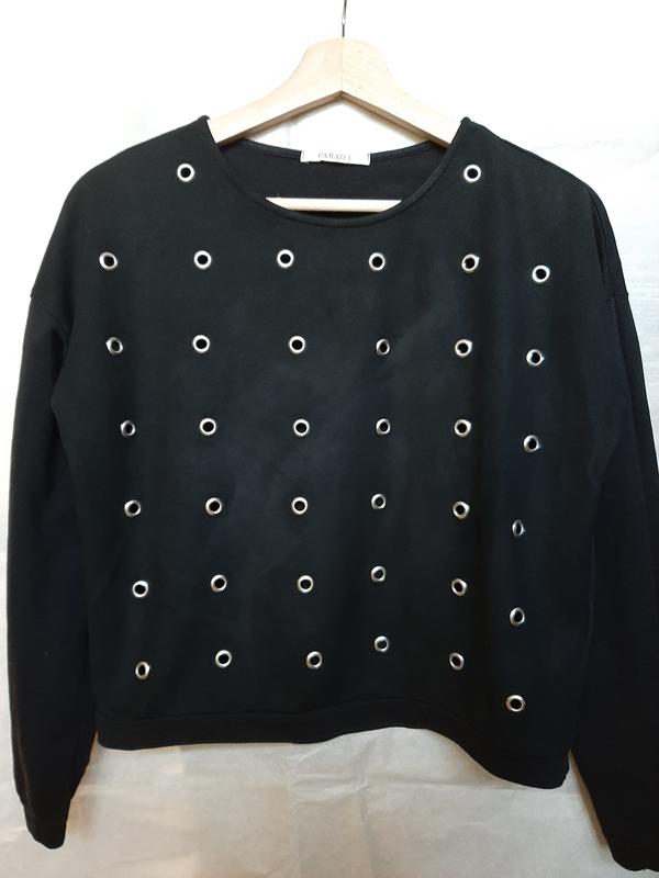 Свитшот с металлическими люверсами, комбинированная ткань - рукава и спинка - трикотаж трехнитка, перед - экозамш. Очень приятный к телу, насыщенный черный цвет. Плечевой шов спущен. Стан отличный (металл в отм состоянии). Размер xs. Замеры: Пог 53 Рукав 46 Длина 49
