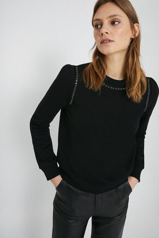Женский свитер черного цвета Бренд: Warehouse; Цвет: черный; Состав: хлопок, полиэстер; Размер: UK 10/44-46/М; Ширина спинки: 39 см; Длина рукава: 63 см; ПОГ: 57 см; Ширина в низу: 47 см; Длина изделия: 63 см. Не хватает двух блесток около шеи, фото прилагается.