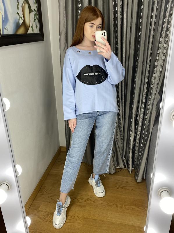 Свитшот небесно-голубого цвета, Италия 🇮🇹 Апликация в виде губ из эко-кожи, металические кольца на горловине. Ткань: мягкий трикотаж Состав: 95% хлопок, 5% эластан Размер уника (от XS до М)
