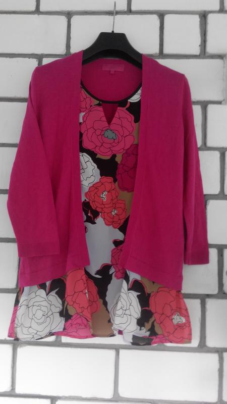Гарна комбінована блузка кардиган відомого бренду Next. Спереду красивий принт в квіти, задня частина насиченого малинового кольору. Вишукана, стильна та гарно дивиться! Дуже м’яка та приємна до тіла. В плечах 40 см ПОГ (під пахвами): 54 см ПОН ( кардигану) 57 см, ( блузки) 60 см, довжина розпірок блузки 13 см ( по кардиган) довжина по спині: 79 см стан нової, без дкфектів Євросток
