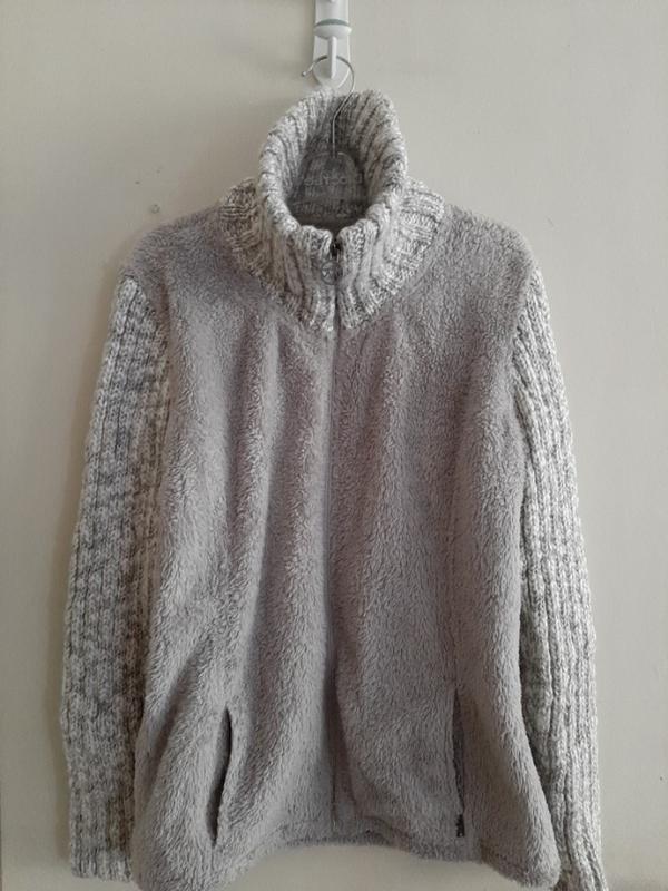 Тепла кофта із в'язниці коміром та рукавами. Є кишені . Довжина 60 см Ног 57 см Нос 55 см Рукав 60 см Висота коміра 14 см