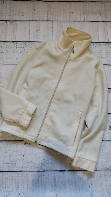 Молочная флисовая толстовка на молнии. Два боковых кармана на молнии. Внизу резинка с фиксаторами. Черная подкладка. Материал мягкий, теплый, плотный. Размер L Плечи 51 грудь полуобхват 55 Низ 54 Длина по спине 66 Новая, бирка срезанная. Склад: 100% полиэстр.