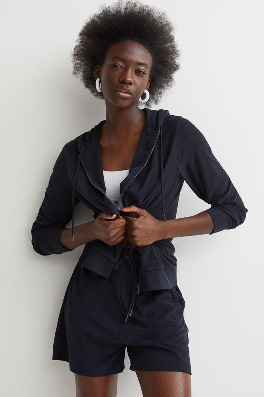 Толстовка на молнии из мягкой махровой ткани. Капюшон на шнурке, застежка-молния и карманы-кенгуру. Слегка опущенные плечи. Манжеты и подол в рубчик. Розмір Л Плечі 43 см, ОБГ 110, довжина рукава 63 см, .