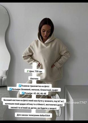 💸Цена: 730 грн Костюм ☑️Ткань трехнитка на флисе ☑️Цвета: Бежевый, меланж, голубой, графит ☑️Размеры: 42-44; 46-48 Базовый костюм на флисе который должен быть у каждого, двойной капюшон который придает объем и устойчивость, костюмчик очень теплый и мягкий на ощупь, вы будете в восторге 💻Администратор @************