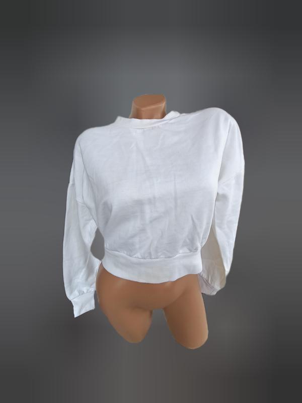 Укороченная белая толстовка без капюшона. В середине небольшой мягкий набросок. В хорошем состоянии. Сзади у горловины наклейка. Страна производитель Пакистан Ткань 45% коттон, 55% полиэстер Размер М Длина изделия по спине 42 см Длина приспущенного рукава 47 см Длина плеча 22 см Полуобхват грудей 57 см Полуобхват низу светра 41 см