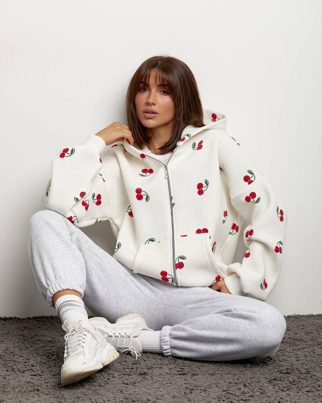 Кофта свободного фасона оверсайз на молнии с капюшоном с принтом вишни