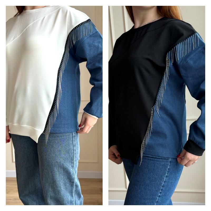 Свитшот двунитка купить в Мода-Позитив Модель: 163 Размер: 48-52, 54-58, 60-64 Ткань: двунитка+джинс Цвет: черный, молоко Свитшот с бахромой - это современный трендовый элемент гардероба, который добавляет нотку игривости и оригинальности классическому спортивному стилю. Такая одежда сочетает комфорт и стиль, позволяя создавать уникальные образы для любых случаев - от прогулок до стильных вечеринок. - 48-52 Обхват груди 118 см Обхват бедер 118 см Длина рукава 63 см Длина изделия 67 см - 54-58 Обхват груди 128 см Обхват бедер 128 см Длина рукава 64 см Длина изделия 70 см - 60-64 Обхват груди 138 см Обхват бедер 138 см Длина рукава 65 см Длина изделия 72 см