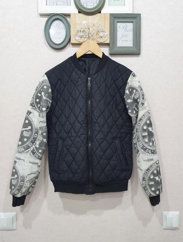 Размер не указан, поэтому ориентируйтесь по замерам дл 59, пог 46, плечи 42, рукав 61 см. более похож на S. сама кофта болоньевая, стеганая утепленная, рукава плотный трикотаж. Оплата на карту