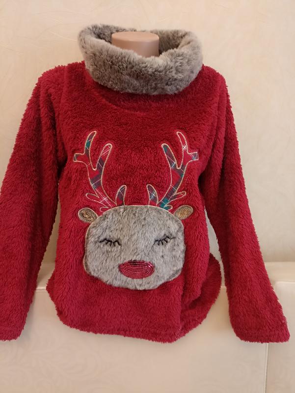 Женская теплая толстовка красного цвета с аппликацией оленя. Размер S