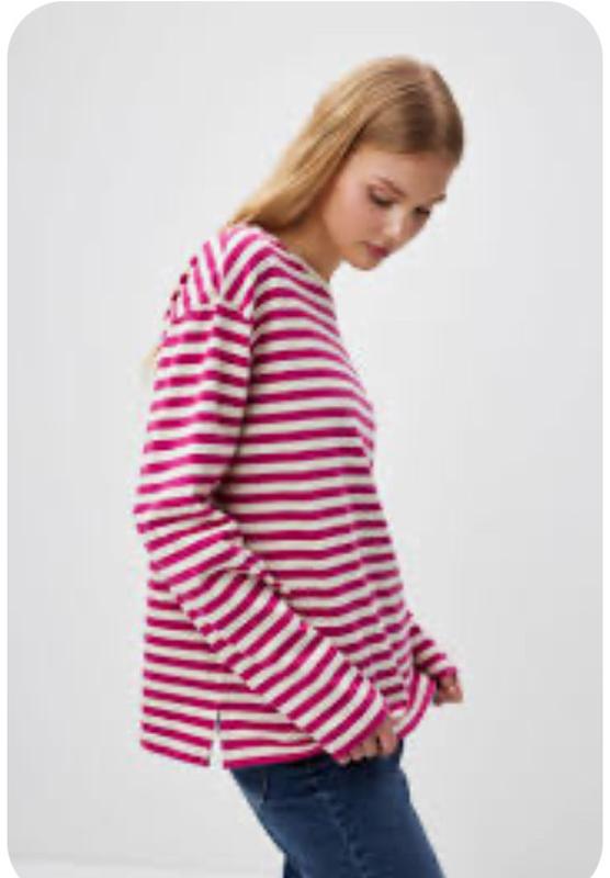 Новий лонгслів сучасна модель в смужку дуже яскраво малинового кольору. Завжди буде в нагоді. Довжина 67 см НОГ 56 см