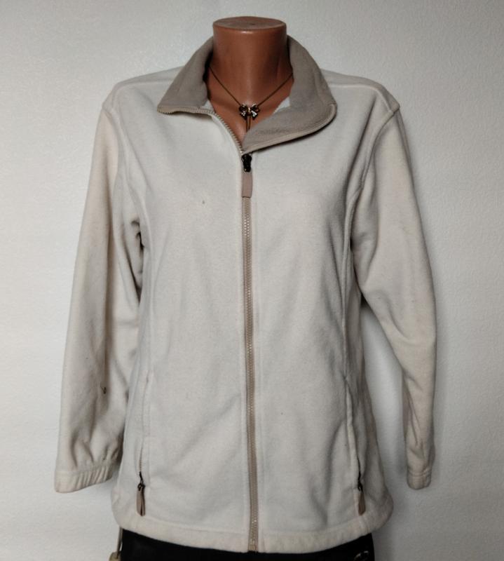 Классная флисовая кофта, очень теплая. Цвет молочный. Имеются незначительные дефекты, пятнышки как от чернил, должны отпрягаться (вверх на груди возле молнии и внизу сзади). Небольшая полоска с дырочкой спереди у подмышки. Эффекты показаны на фото. Размер указанного 8, но будет на большее, смотрите замеры: длина 66 рукав 54 плечи 46 пог 50-54 пост 52-54 (регулируется резинкой)
