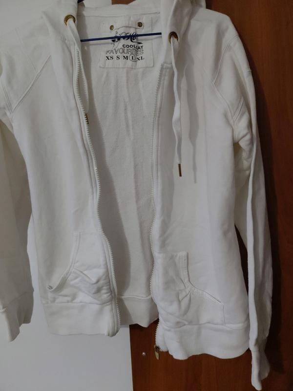 белая толстовка на молнии с капюшоном. ог 49 длина рукава от горловины 84 см длина по спинке 58 см