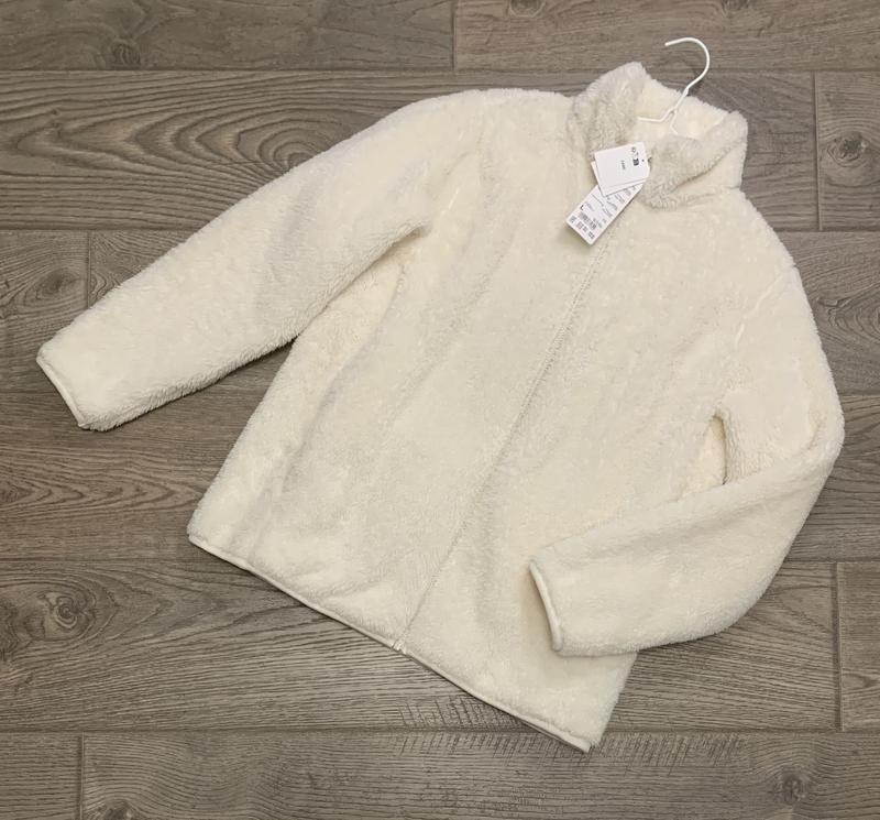 Толстовка фліска шерпа Uniqlo р. L/40/12 Дуже мʼяка, тепла, комфортна та легка Заміри - напівобхват грудей 58 см, довжина по центру спини 67 см + 7 см висота коміру, рукав 60, плечі 41. М'який, теплий та легкий фліс з довгим ворсом. Комір-стійка зігріває шию. Окантовка по низу та манжетам запобігає проникненню холодного повітря. Колір - молочний.
