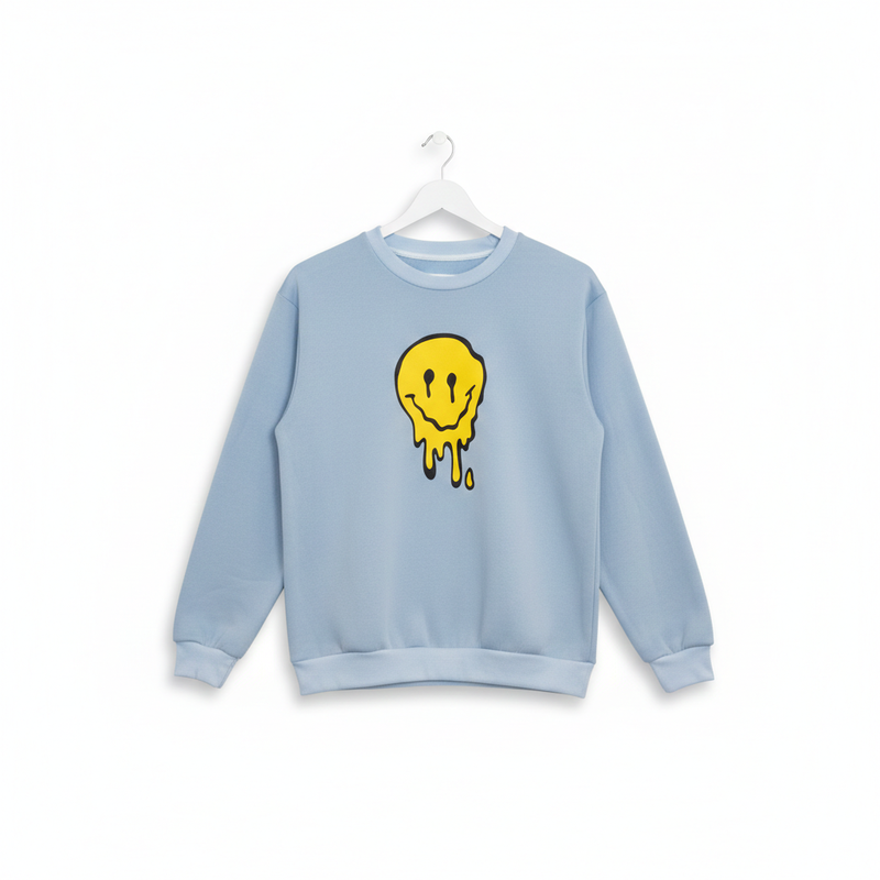 Яркий акцент в виде «стекающего» желтого смайла на нежном голубом фоне. Классический свободный крой с круглым вырезом и эластичными манжетами.: Плотный полиэстер, идеальный для повседневной носки.Идеальное состояние, утепленный флисом длина 64 рукав от горловины 74 пог 50