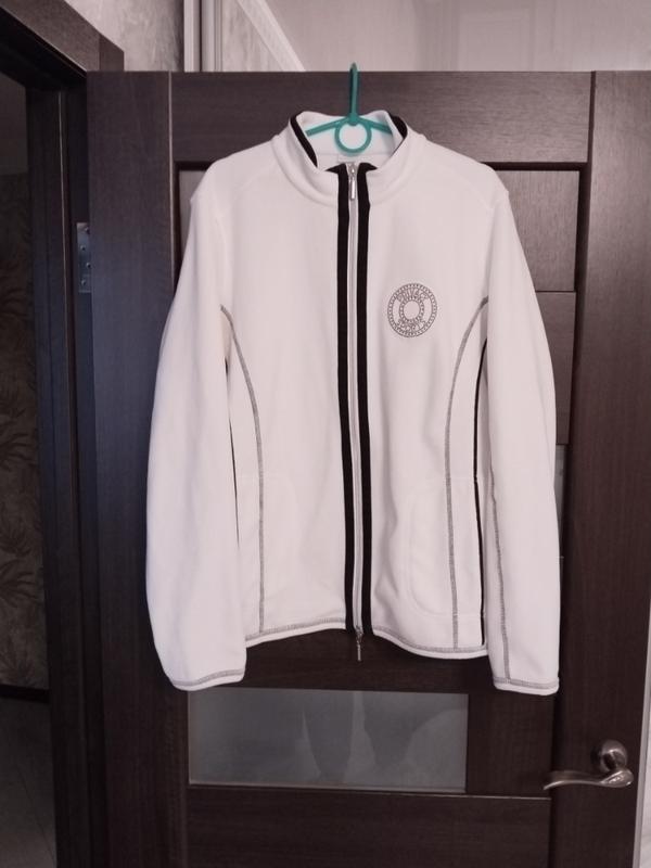 Женская кофта ,состояние отличное ,белая ,логотипы украшены стразами ,змейка оригинал ,ОГ-125,ОБ-125,длина -66см, рукав (от плеча)-65см.Оплата на карту.