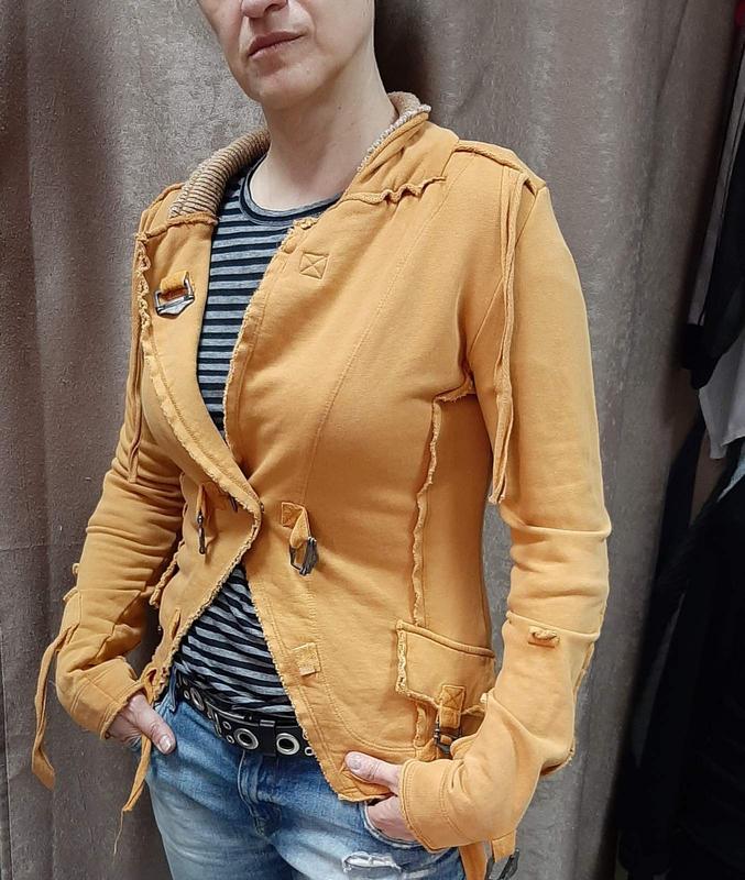 Весенняя куртка горчичного цвета. Очень необычный сложный крой, приталенного фасон, из натурального трикотажа. Размер М. ПОГ - 48 см, плечи - 46 см, рукав- 68 см, длина- 55 см. Производство Турции.