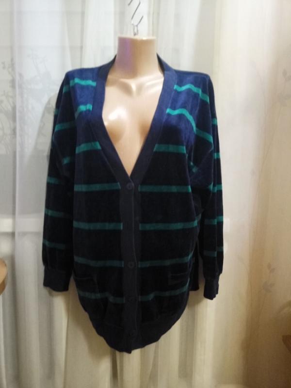 бархат, цвет синий с зеленой полоской, размер 50-52, замеры:плечи (приспущенные)55, 5, рукав49, длина 67, объем 58, iзян-нет 1 пуговица.