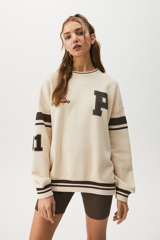 Толстовка оверсайз с деталями в рубчик, нашивками и круглым вырезом.