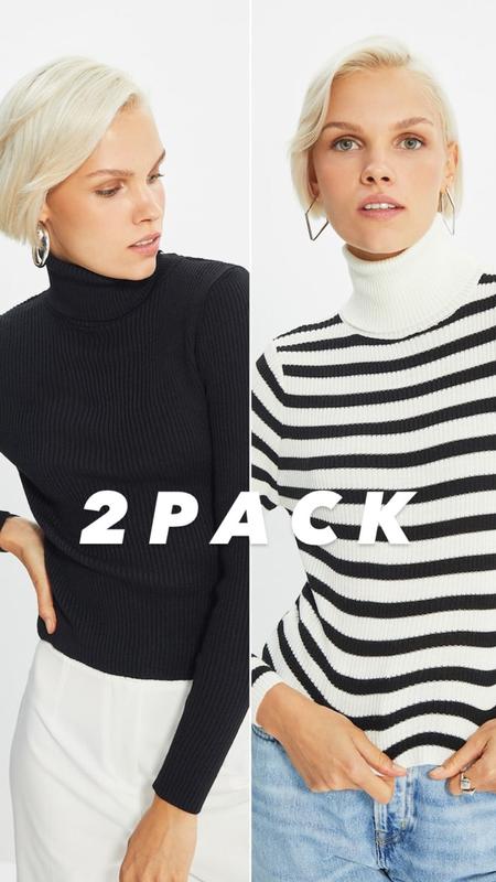 Жіночий набір водолазок у рубчик 2 pack Trendyol - високий комір - в'язка в рубчик - Приталений фасон - 100% акрил - 2 шт. в упаковці Колір: milk/camel | black/stripe | indigo/stone Розмір: S | M - параметри моделі на фото 176 см | 84х63х94 см - розмір S/36 __________________ * Доставка протягом 15-20 робочих днів після замовлення. У вартість вже включено доставку з ЄС Ви оплачуєте доставку по Україні поштою при отриманні замовлення.