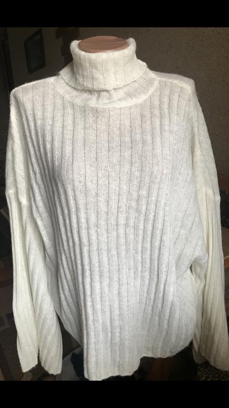 Хорошего качества приятно на ощупь мягкий, оттенок белый.Фасон свободный теплый, совсем не колючий Вниз рукава расширен. Рукав со спущенной линией плеч,гольф идет как оверсайз. Стан - идеальный. Замеры: Длина гольфа 64см Дольше рукава отверлоски 77см, Ширина подмышками 65 см,