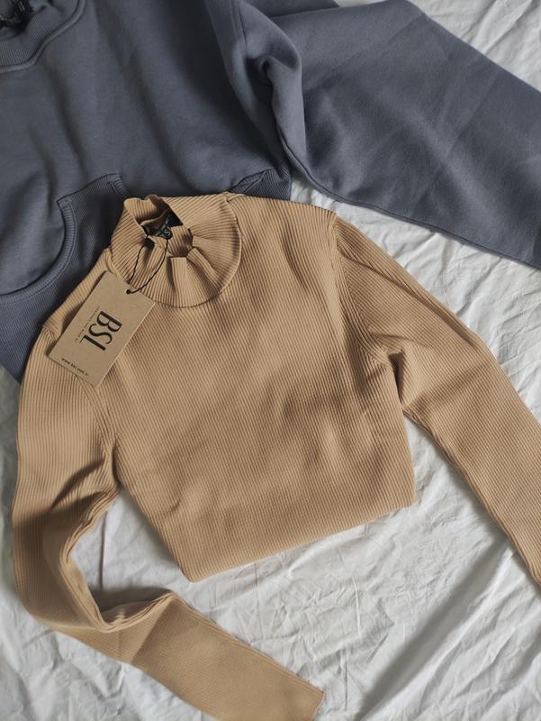 Бежевый гольфик водолазка, размер указан М, также подойдет на S. В рубчик, отлично тянется.