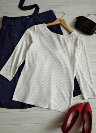 Водолазка в рубчик с глубоким вырезом на спине. Цвет не белоснежный, а молочный, состояние новой. без следов ношения. Ткань хорошо тянется. ПОГ 46 ПОТ 42 Низ 46 Длина 64 Плечи 40 Рукав 49 Глубина выреза 18 Состав: 62% полиэстр, 33% вискоза, 5% эластан