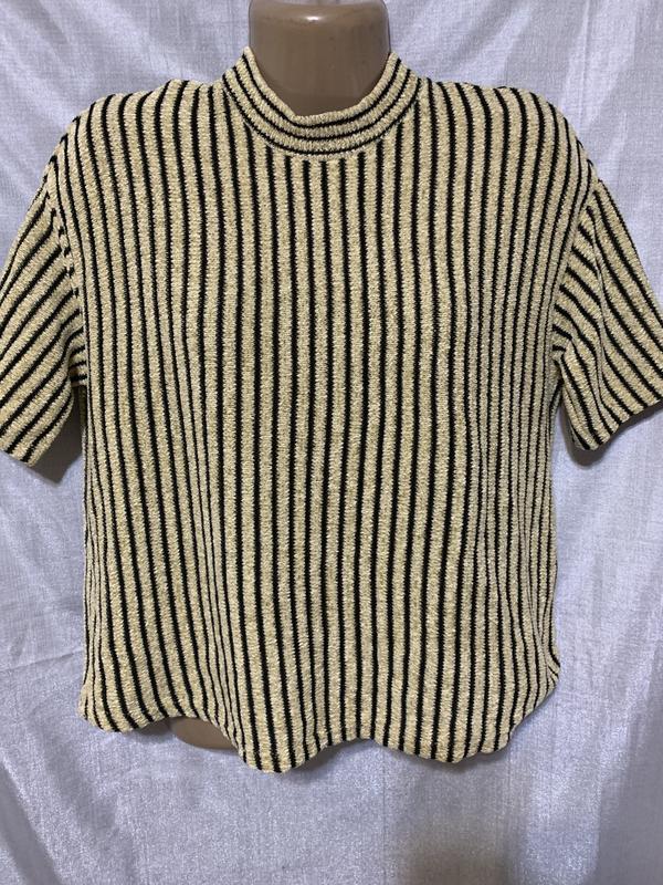 Трикотажна кофта з горловиною стійкою і короткими рукавами. Заміри: довжина - 57см., плечі - 49см., рукав - 18см., ПОГ - 52см., ПОТ - 51см., ПОБ - 55см