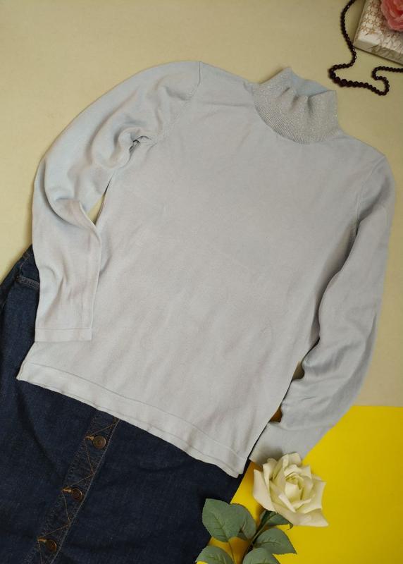 Джемпер під горло,гольф ніжно- блакитний з люрексом на комірці,тягнеться, довгий рукав р. М Довжина 58см ПОГ 44-тягнеться 48см Плечі 34см Рукава 60см