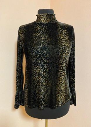Эластичный велюровый гольф, размер М указано. Длина - 63см, плечи - 41см, рукав от плеча - 61см, пог - 50см, тянется до 57см, пот - 52см, поб - 57см.
