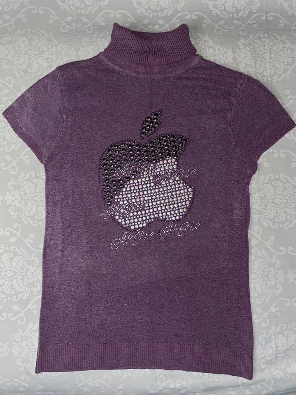 Фиолетового цвета теплая кофта без рукавов, с горлом. Хорошо тянется, на груди рисунок - яблоко из страз и др. Сотояние очень хорошее (см. фото) плечи - от 35см до 40, от шеи до низа по спине - 57см, грудь - от 38см до 47см, талия - от 37см до 47см, низ - от 40см до 50см Пишите в личные сообщения, отвечу на все вопросы, по желанию дополню фото.