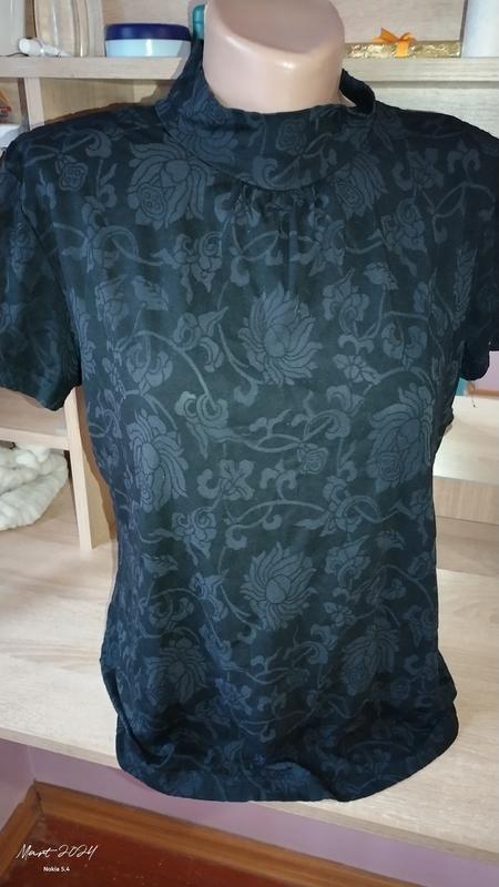 водолазка, короткий рукав,на шее присобрано, хорошо тянется, ткань в виде выбитой под гепюр ❗ состояние очень хорошее без дефектов присутствуют незначительные следы носки 🏷️50 📐Пог 52 длина 58 🎨 черный и свет черный (просветляется по мере)