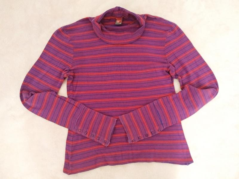Гольф в яркую полоску с широким воротником. В хорошем состоянии. Имеет пуговицы на манжетах для декора. Длина гольфа 55 см, длина рукава от воротника 81 см. Окружности по линии груди 92 см, талии 80 см, по низу 92 см. Достаточно хорошо тянется, подойдет на размеры до XL.