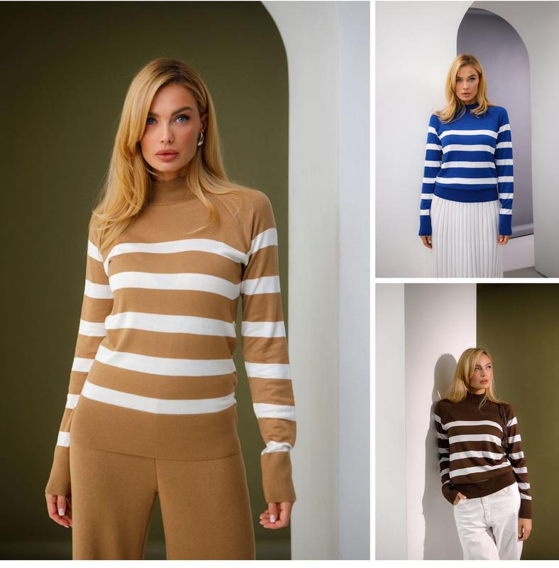 Базовый гольф в полоску из тонкой и шелковистой вискозы с хлопком. Изделие свободного силуэта имеет рукав-реглан с комфортной низкой линией проймы, манжеты на рукавах и по низу изделия Длина около 63-64-65 см (+- 2 см). Ширина под проймой и в талии в спокойном нерастянутом состоянии 46-50-54 см. В растянутом состоянии 52-56-60 см. Ширина по низу 38-42-46 см. Длина рукава 73-74-75 см. Высота проймы 25-27-29 см. Высота воротника 7 см. Высота манжеты 11 см. Состав и уход 60% - БАВОВНАЯ 40% - ВОСКОЗА