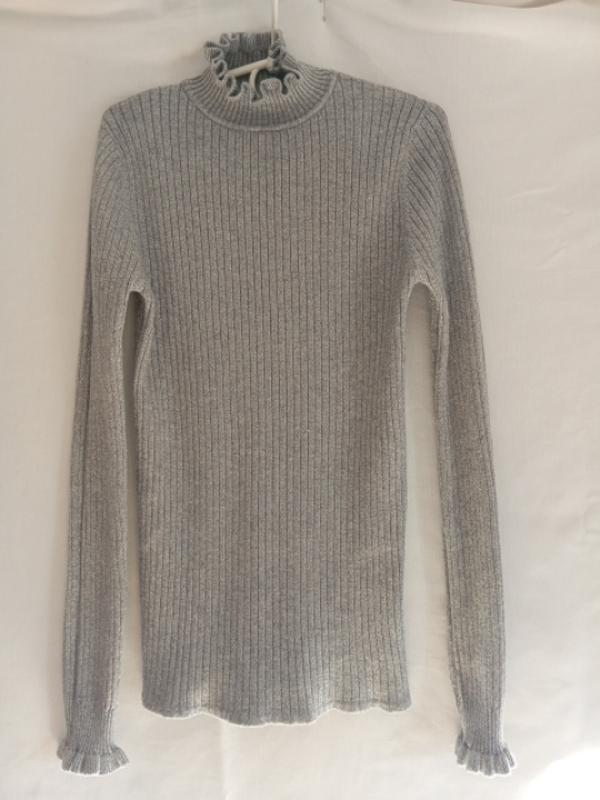 Серая водолазка с люрексом.р.S.M.по горловине и низу рукавов воланы.в рубчик.