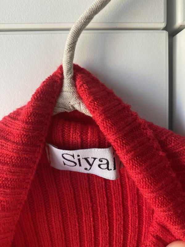 Красная водолазка с интересным вырезом спереди от бренда Siyai (второе по-другому называется). Очень приятный к телу, просто пирышко. Будет классно смотреться с белым низом.